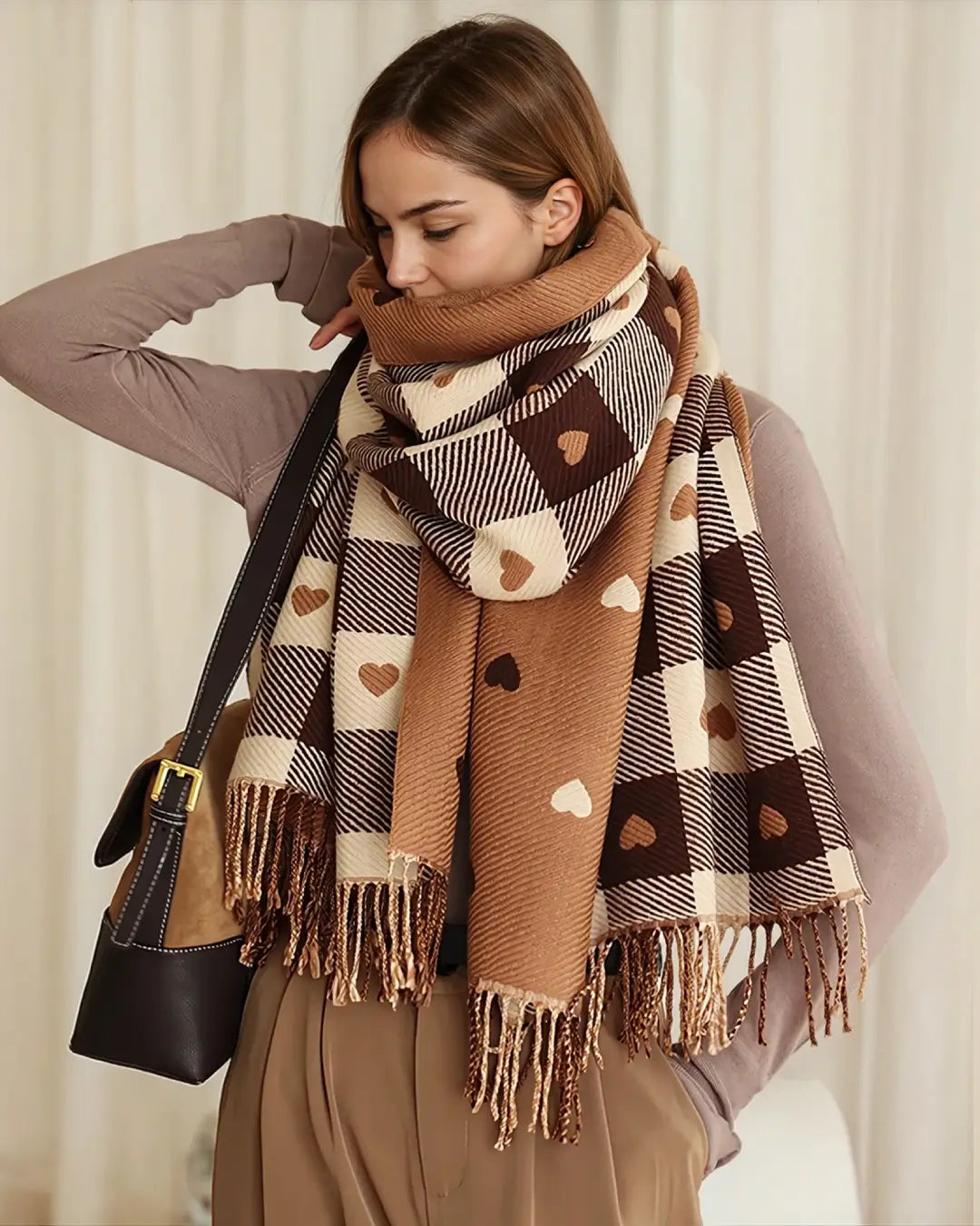 Écharpe en tissu doux conçue en laine mélangée à du cachemire. Motif à carreaux avec imprimés coeurs. Franges sur les largeurs. Dimensions 70x200 cm. Matière épaisse et très douce, maintient bien au chaud.