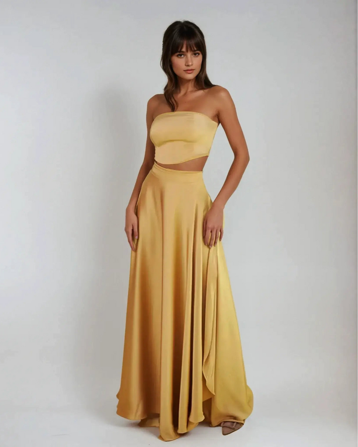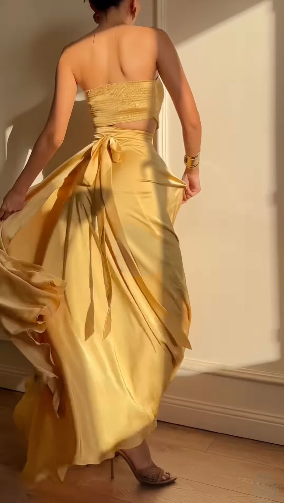 - Ensemble Haut et Jupe Doré : une tenue deux-pièces qui attire tous les regards, parfaite pour sublimer votre silhouette avec éclat.