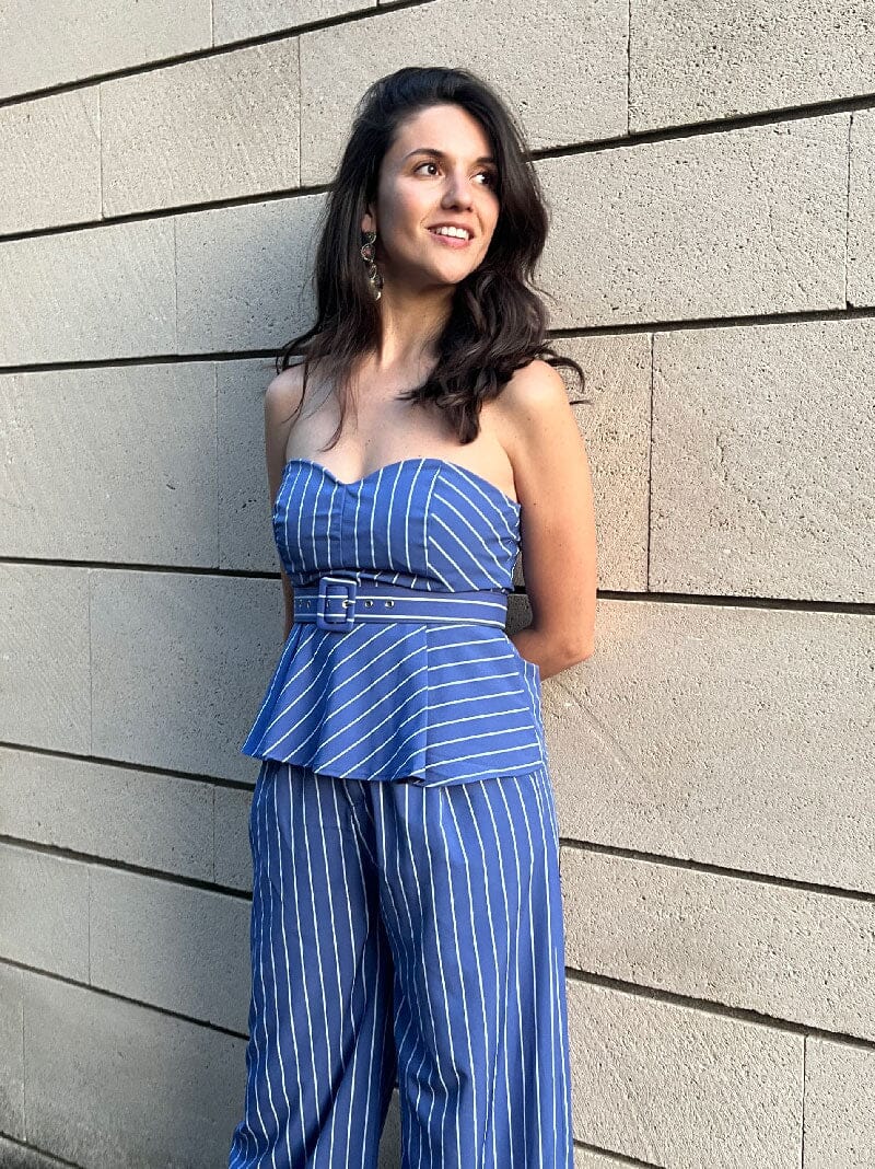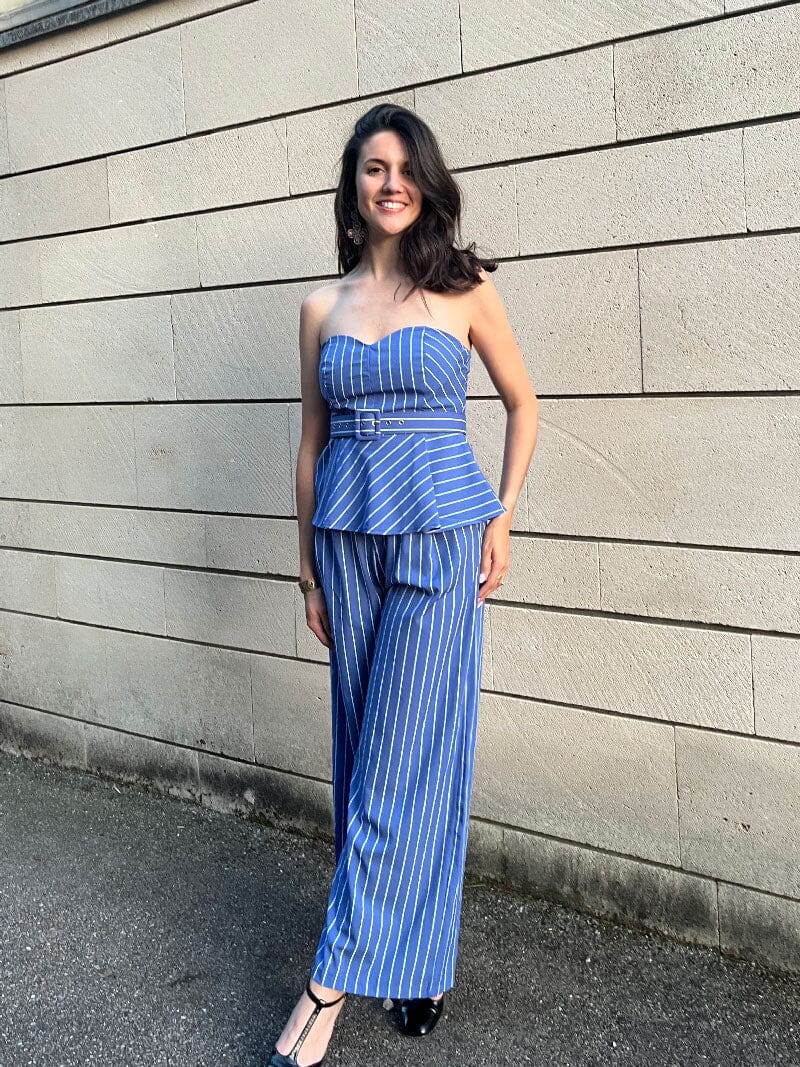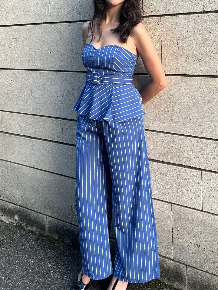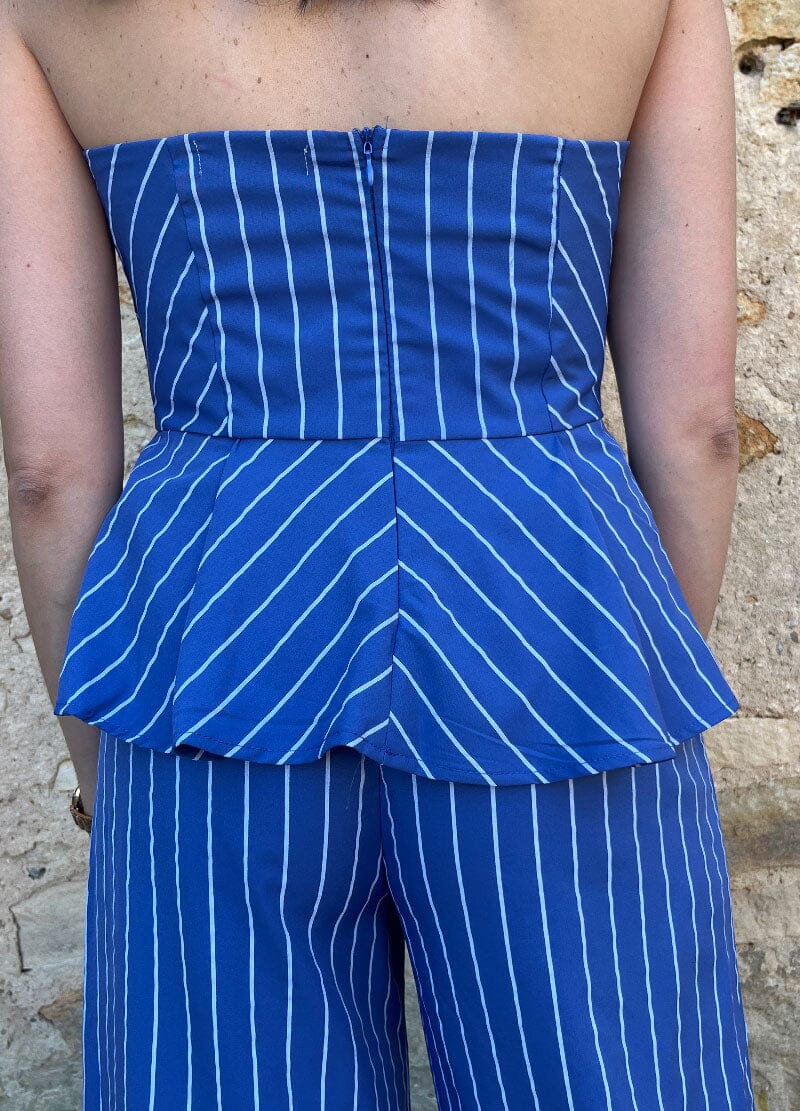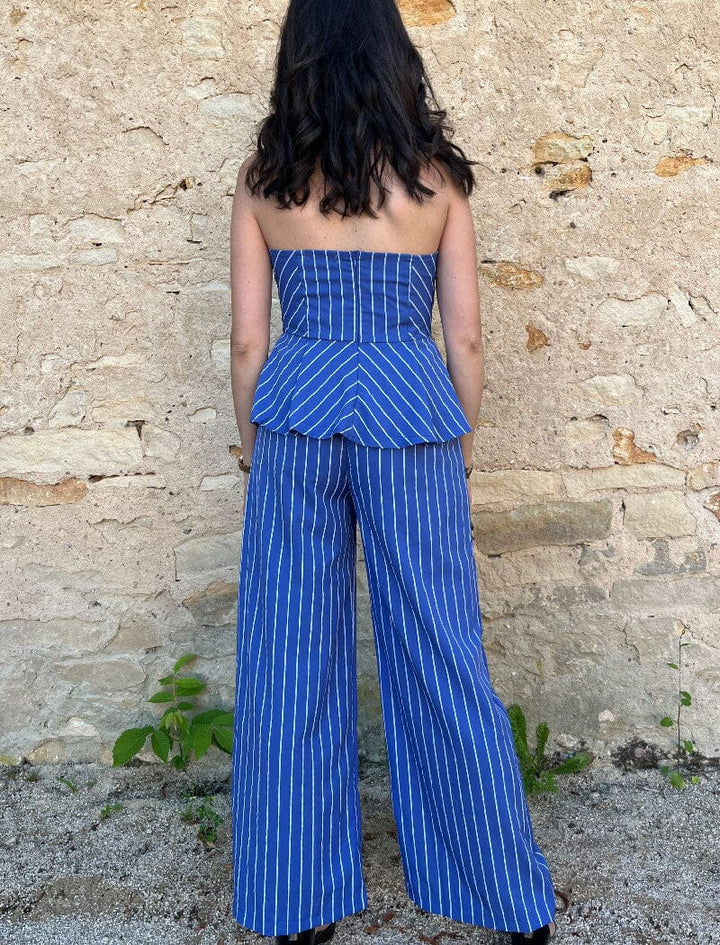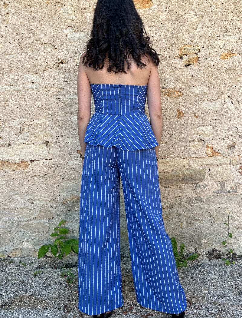 Élégant Ensemble Pantalon bleu rayé blanc, parfait pour une soirée chic ou en tant qu'invitée à un mariage.
