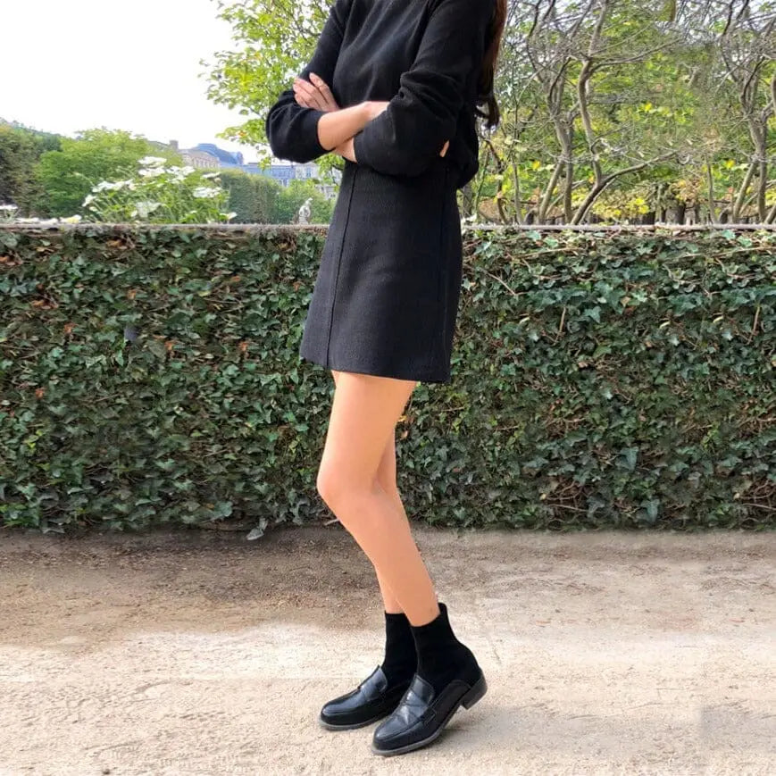 femme portant une jupe trapèze noire avec un pull en laine, devant une boutique, idéale pour l'hiver et élégante.