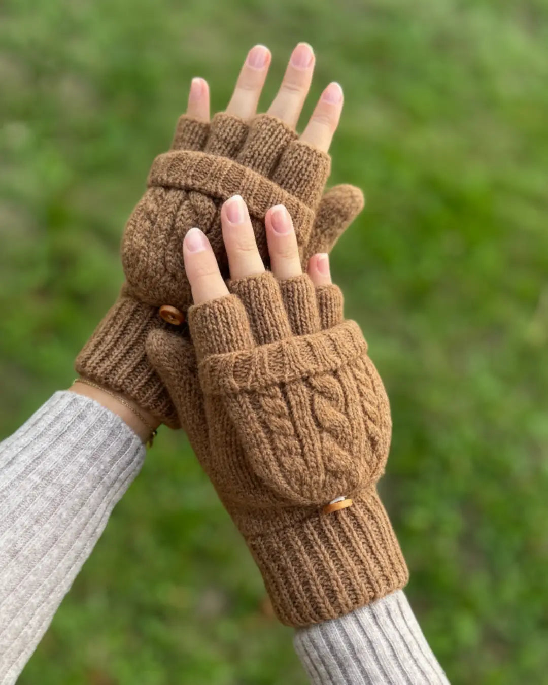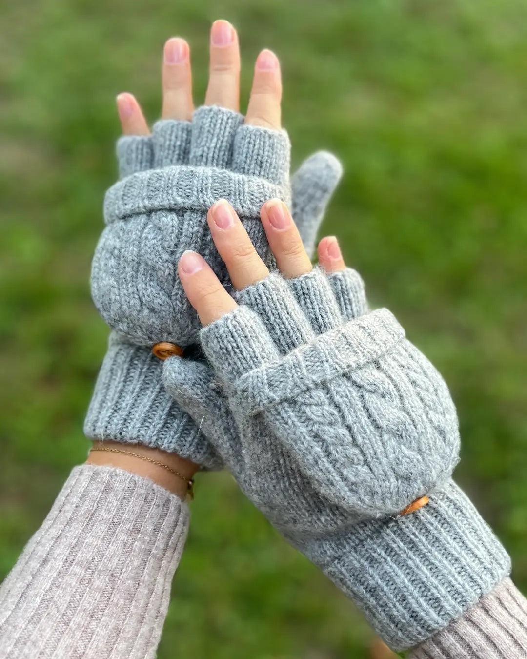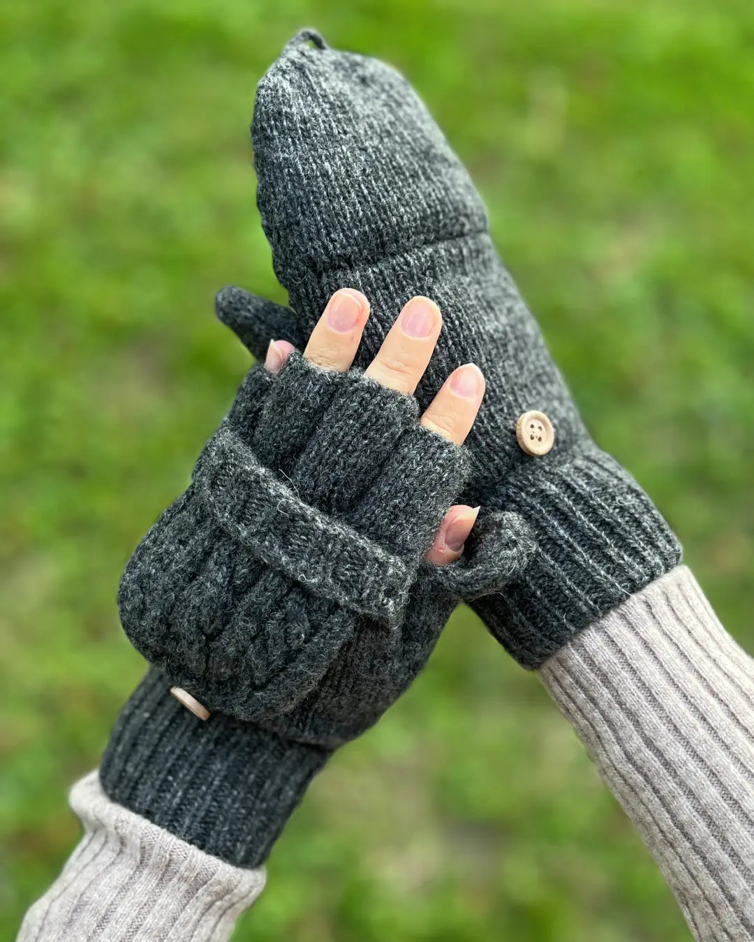 🔄 Le système convertible : mitaines ou moufles grâce au capuchon repliable fixé par un bouton en bois