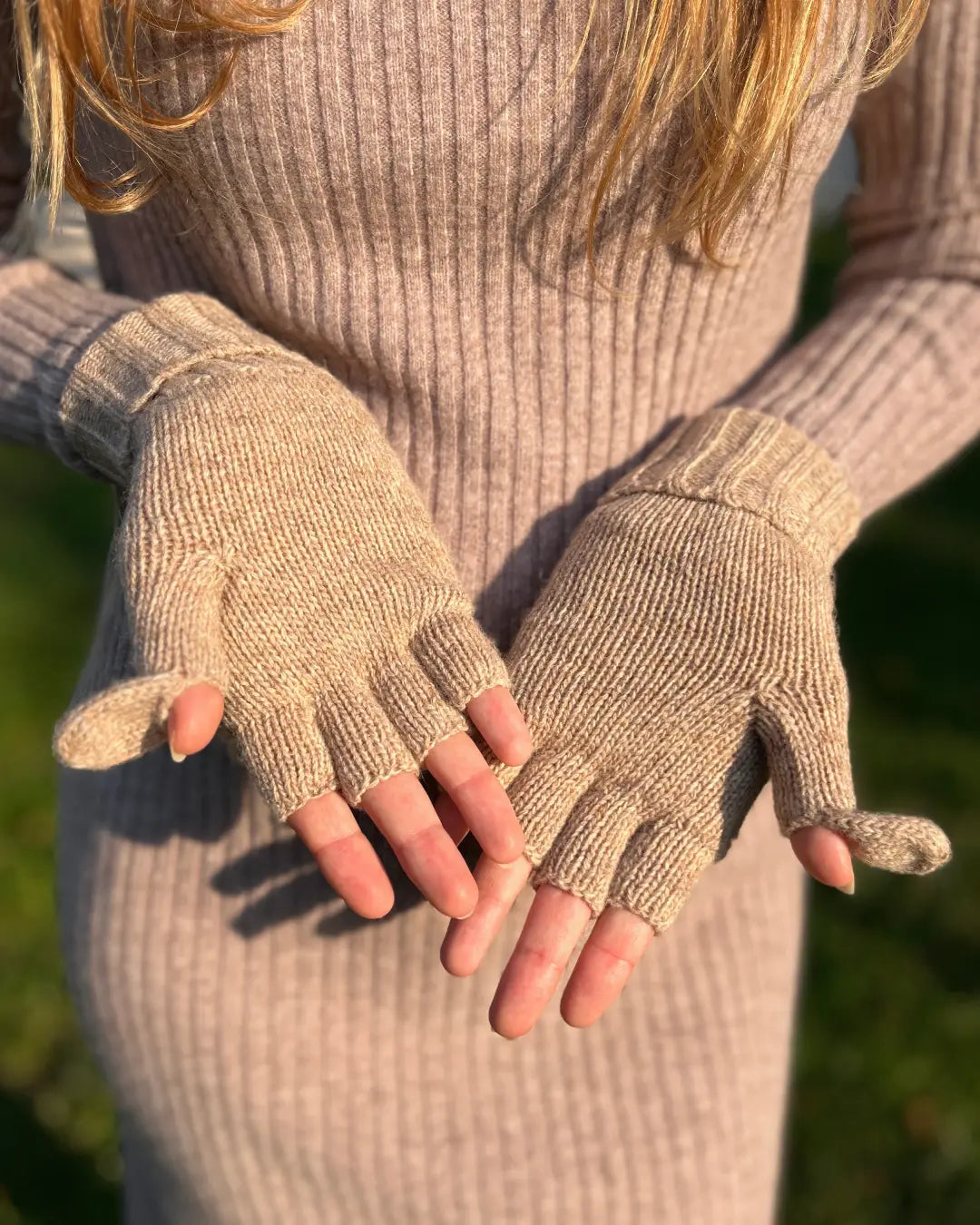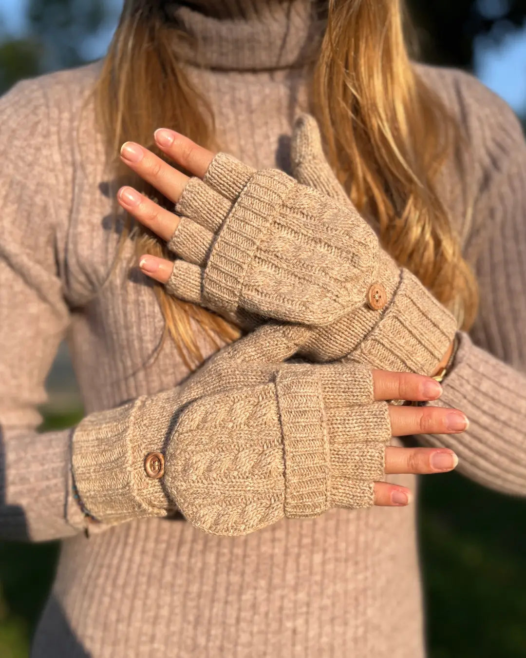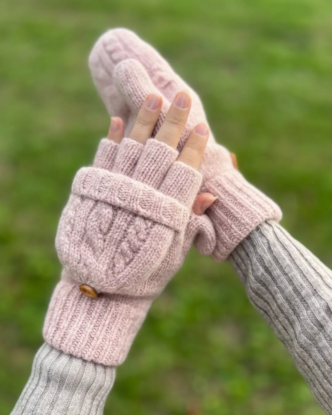 🔄 Le système convertible : mitaines ou moufles grâce au capuchon repliable fixé par un bouton en bois
