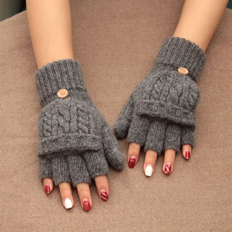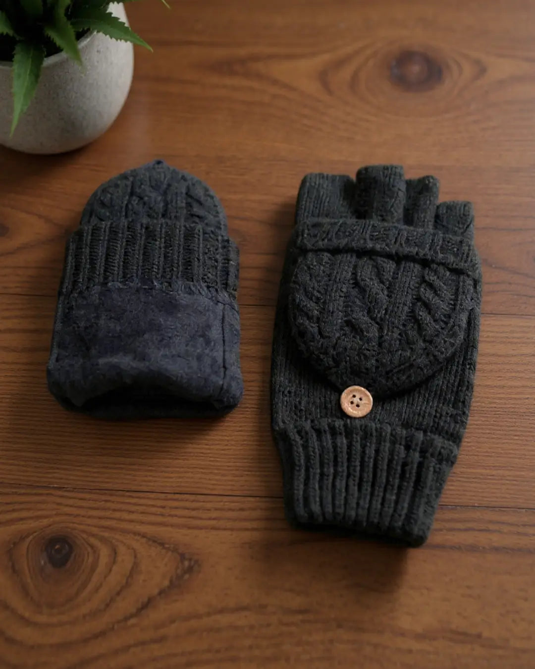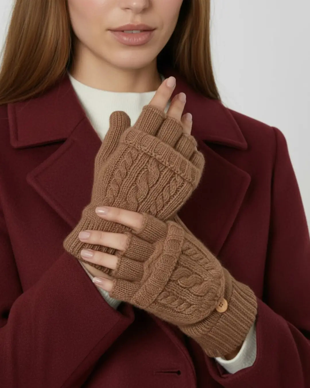 Doublure polaire imperméable et coupe-vent offrant une protection jusqu'à -15°C. maille torsadée. De vraies indispensables pour l'hiver. Mitaines en laine convertibles en moufles grâce aux bords repliables situés au niveau du poignet, accrochés avec un bouton en bois. Petite ouverture sur le pouce pour faciliter l'utilisation d'un smartphone.