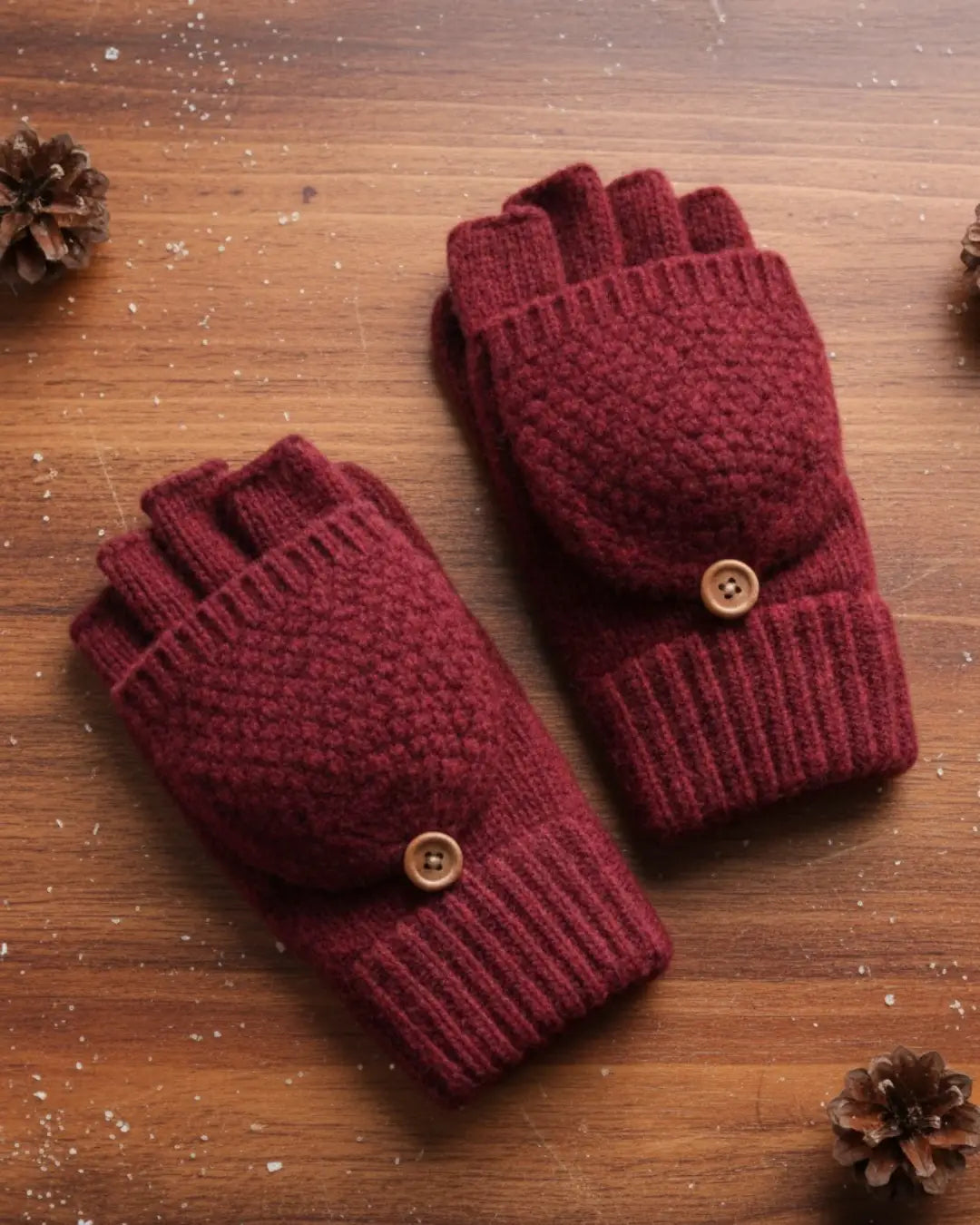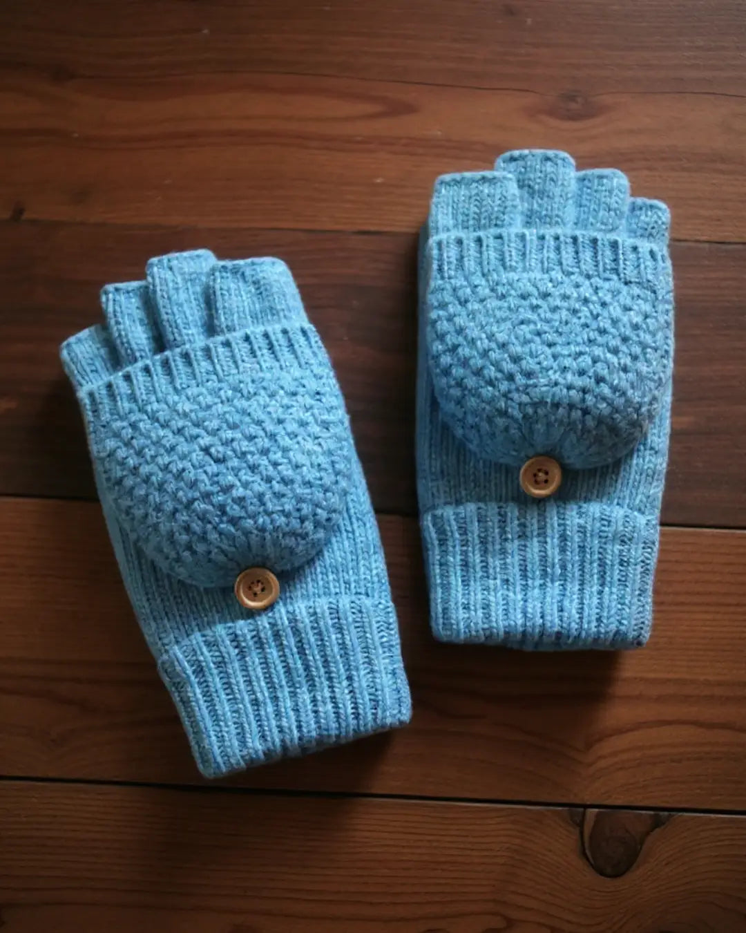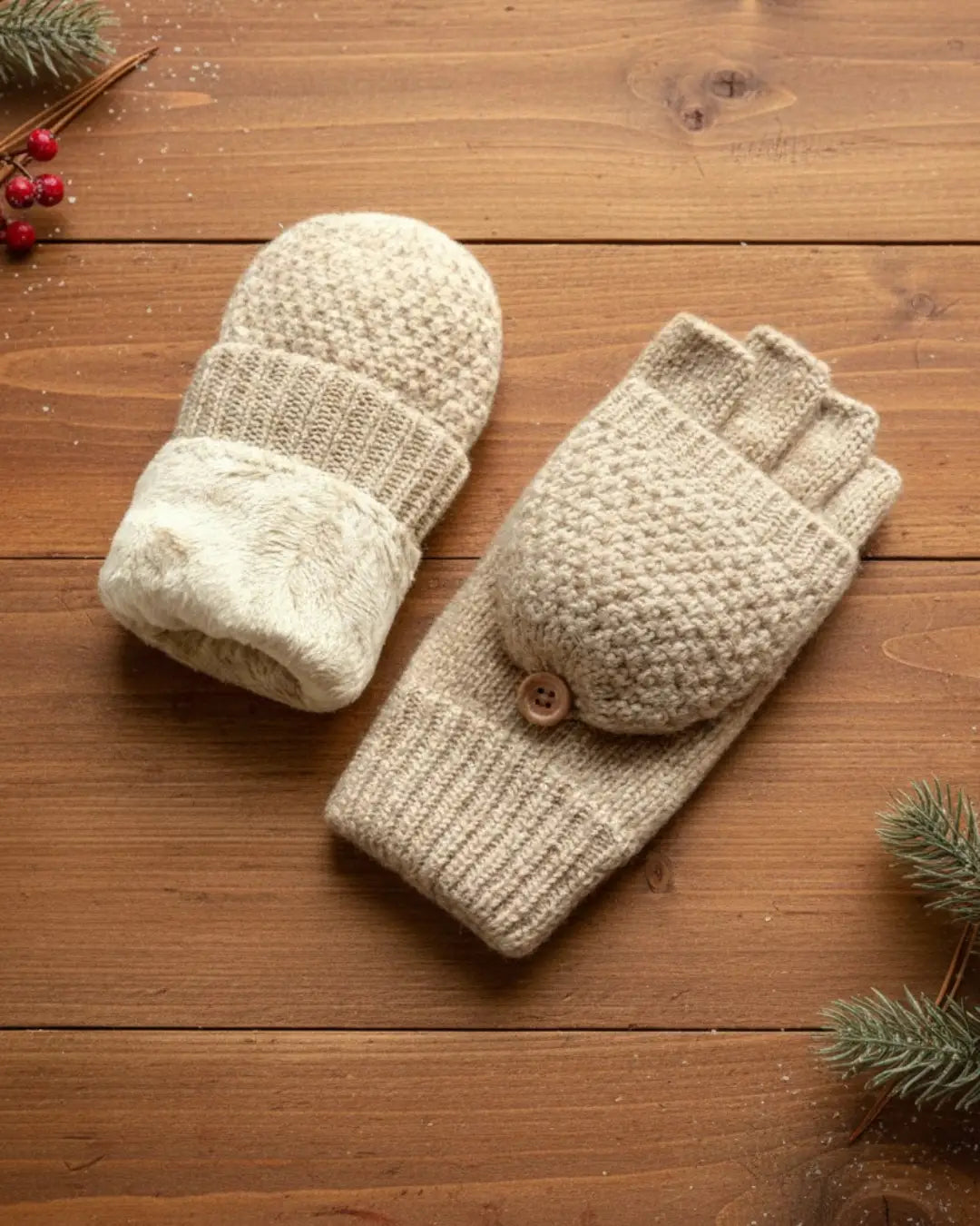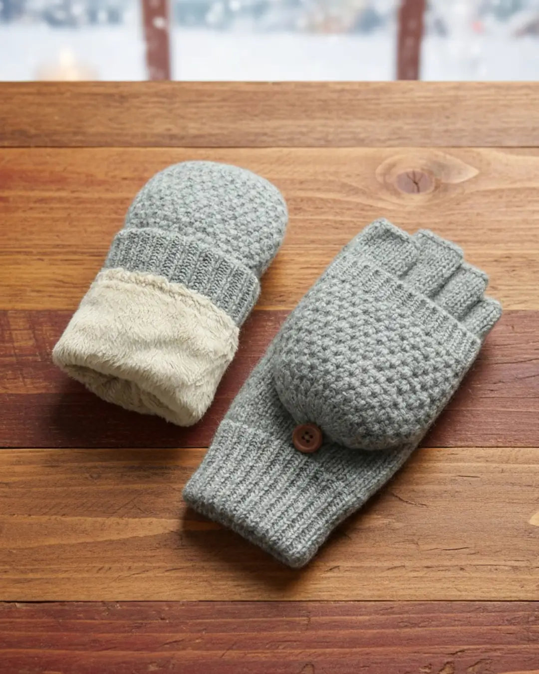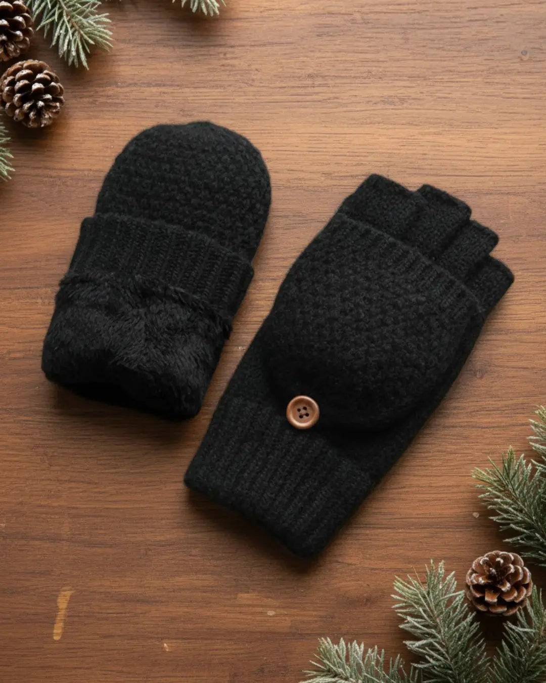 Doublure polaire imperméable et coupe-vent offrant une protection jusqu'à -15°C. De vraies indispensables pour l'hiver. Mitaines en laine convertibles en moufles grâce aux bords repliables situés au niveau du poignet, accrochés avec un bouton en bois. Ouverture sur le pouce pour faciliter l'utilisation d'un smartphone.