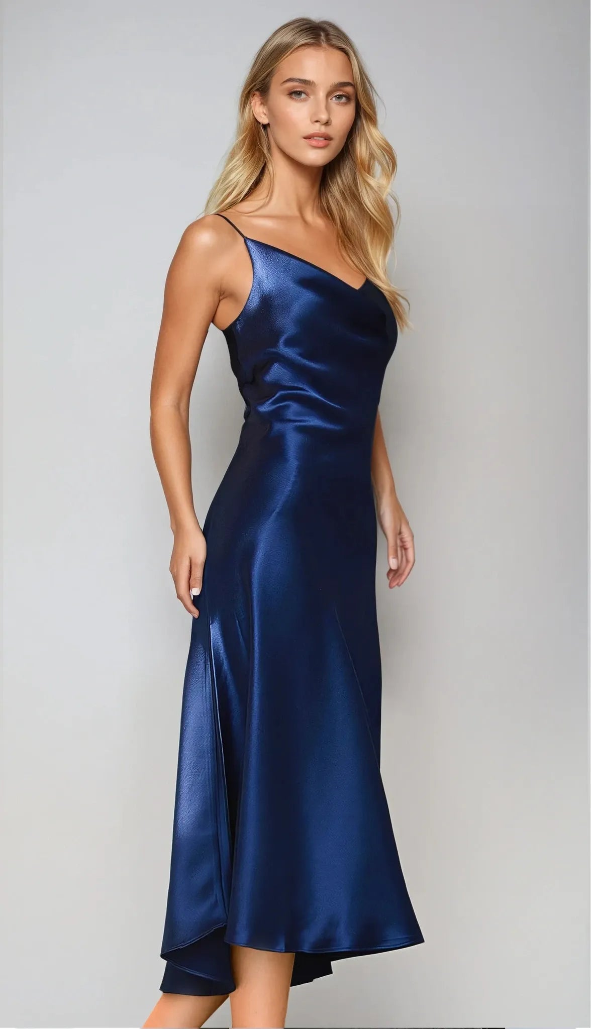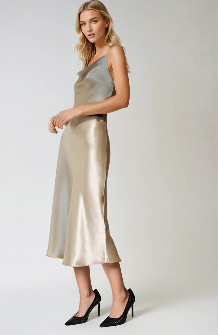 Sa matière satinée fluide épouse le corps sans le mouler, pour une silhouette lissée et une sensation de légèreté.