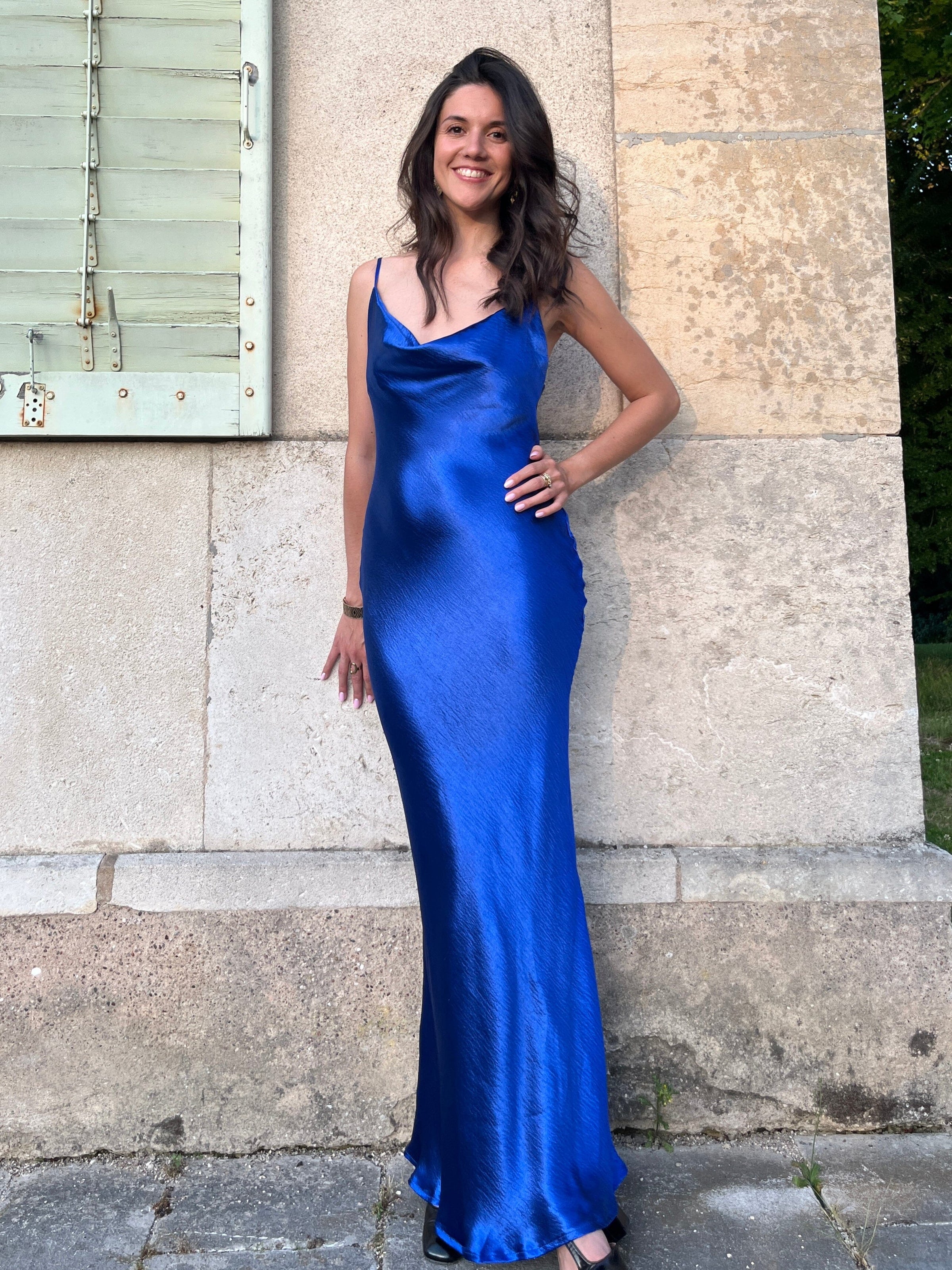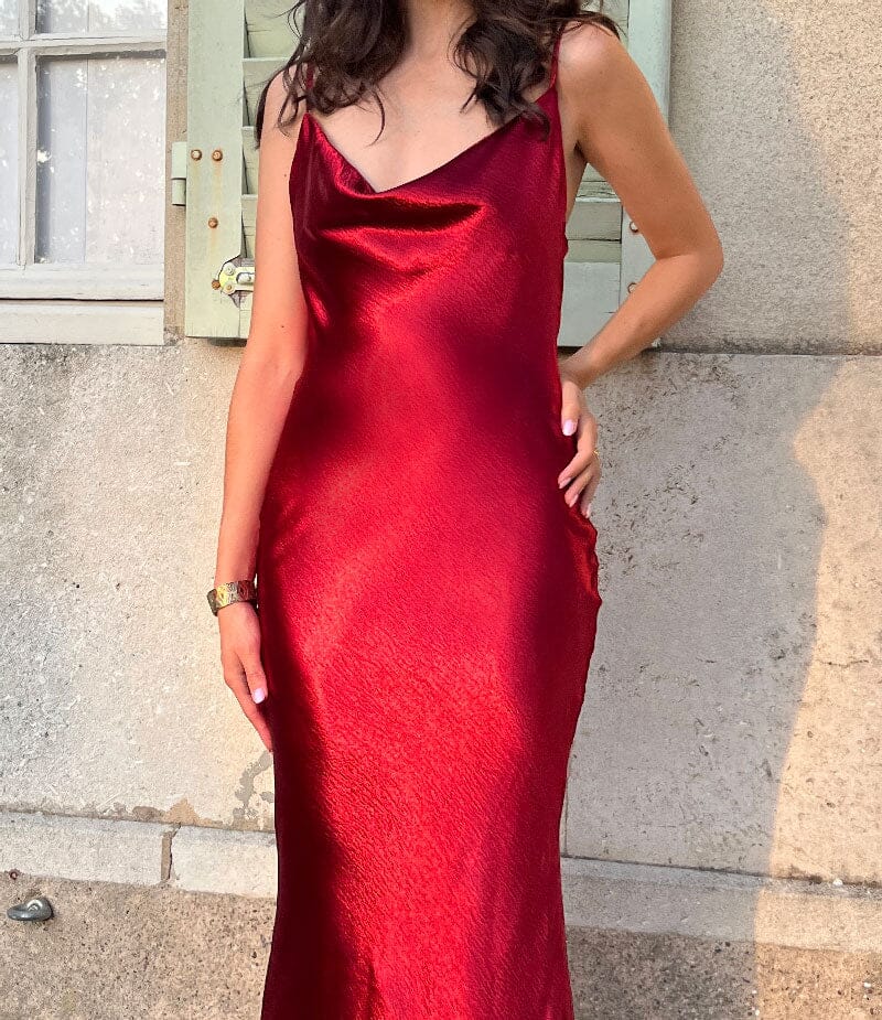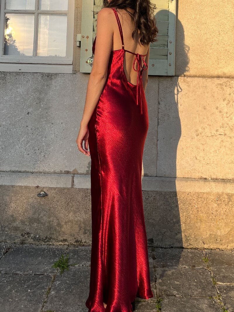Robe longue en satin et dos nu plongeant, tombé fluide longueur chevilles. Matière semi-épaisse et satinée pour un rendu exceptionnel et luxueux. Ultra douce agréable à porter. Encolure carrée effet drapé, bretelles spaghetti réglables qui se rejoignent dans le dos et fermeture à glissière dissimulée sur un côté. Entièrement doublée à l'intérieur. Disponible dans plusieurs coloris, cette robe fera de vous la reine de la soirée en toute élégance, tout en mettant en valeur votre silhouette.