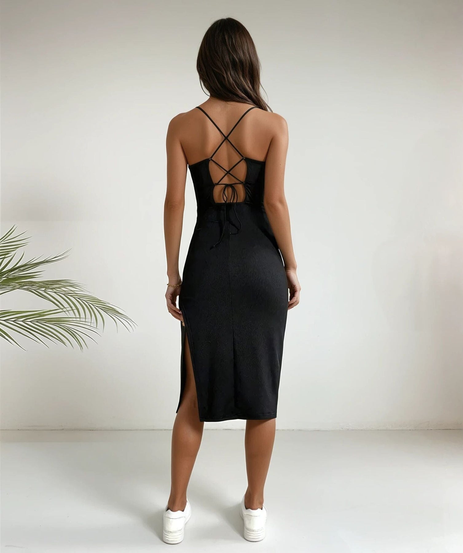 - Détails : Tissu côtelé, dos nu, lacée dans le dos, fendue sur le côté, longueur midi.