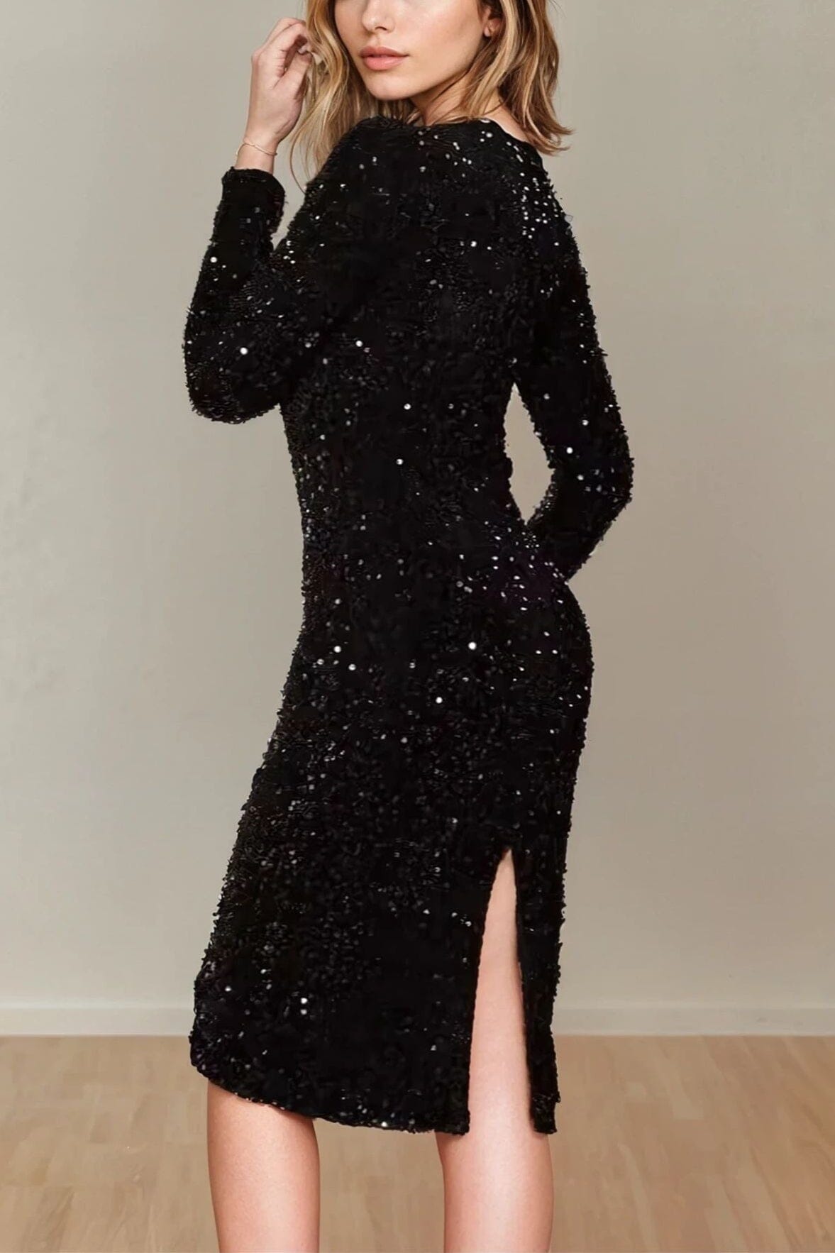 Cette robe fourreau cocktail est la tenue idéale pour briller en toute élégance cet hiver. Son design mi-long et scintillant sublime chaque silhouette avec un équilibre parfait entre confort et glamour.