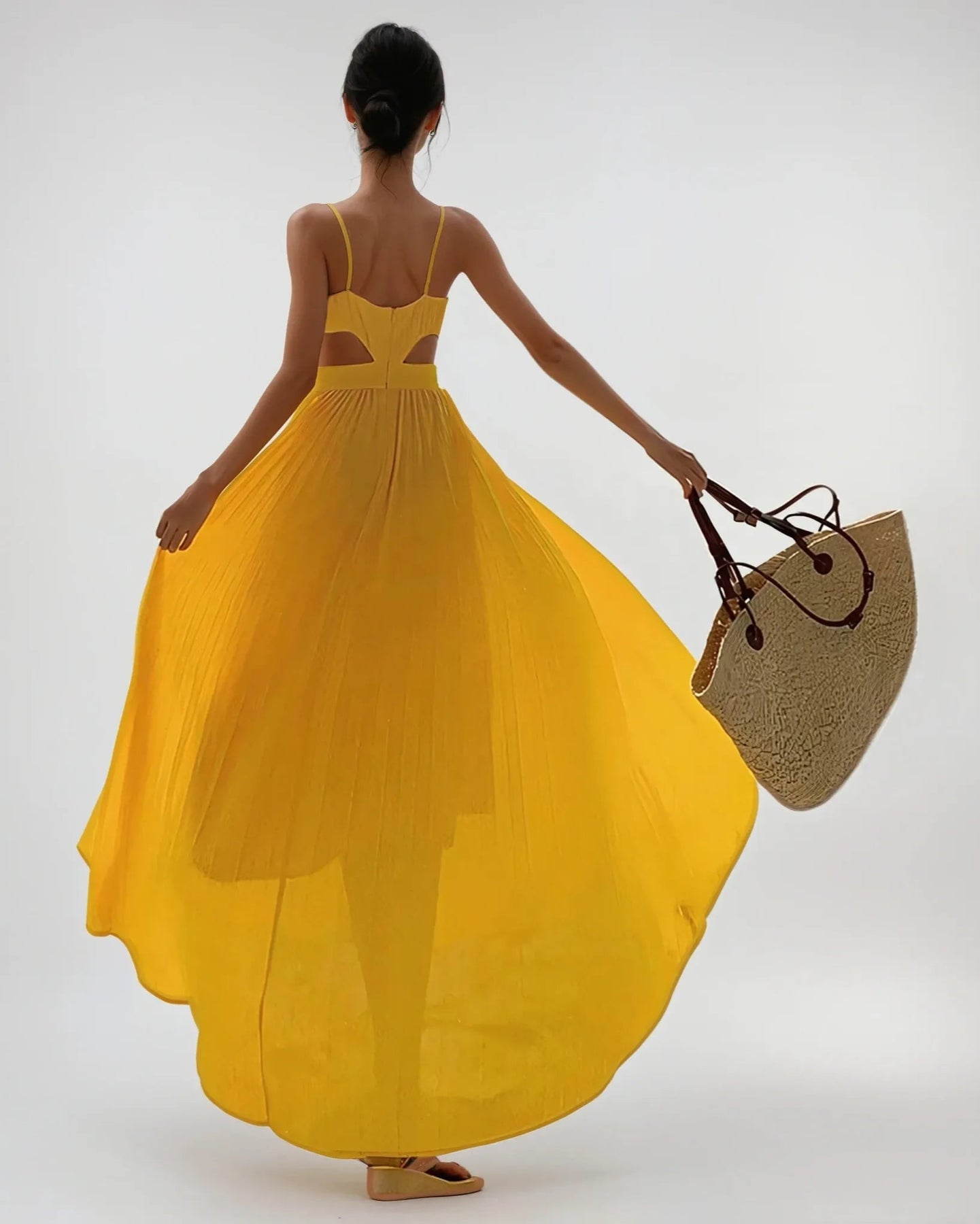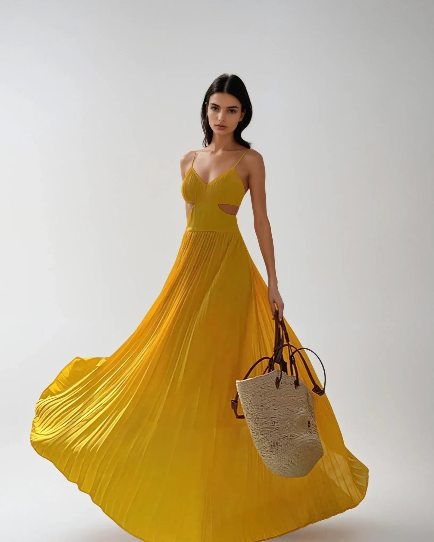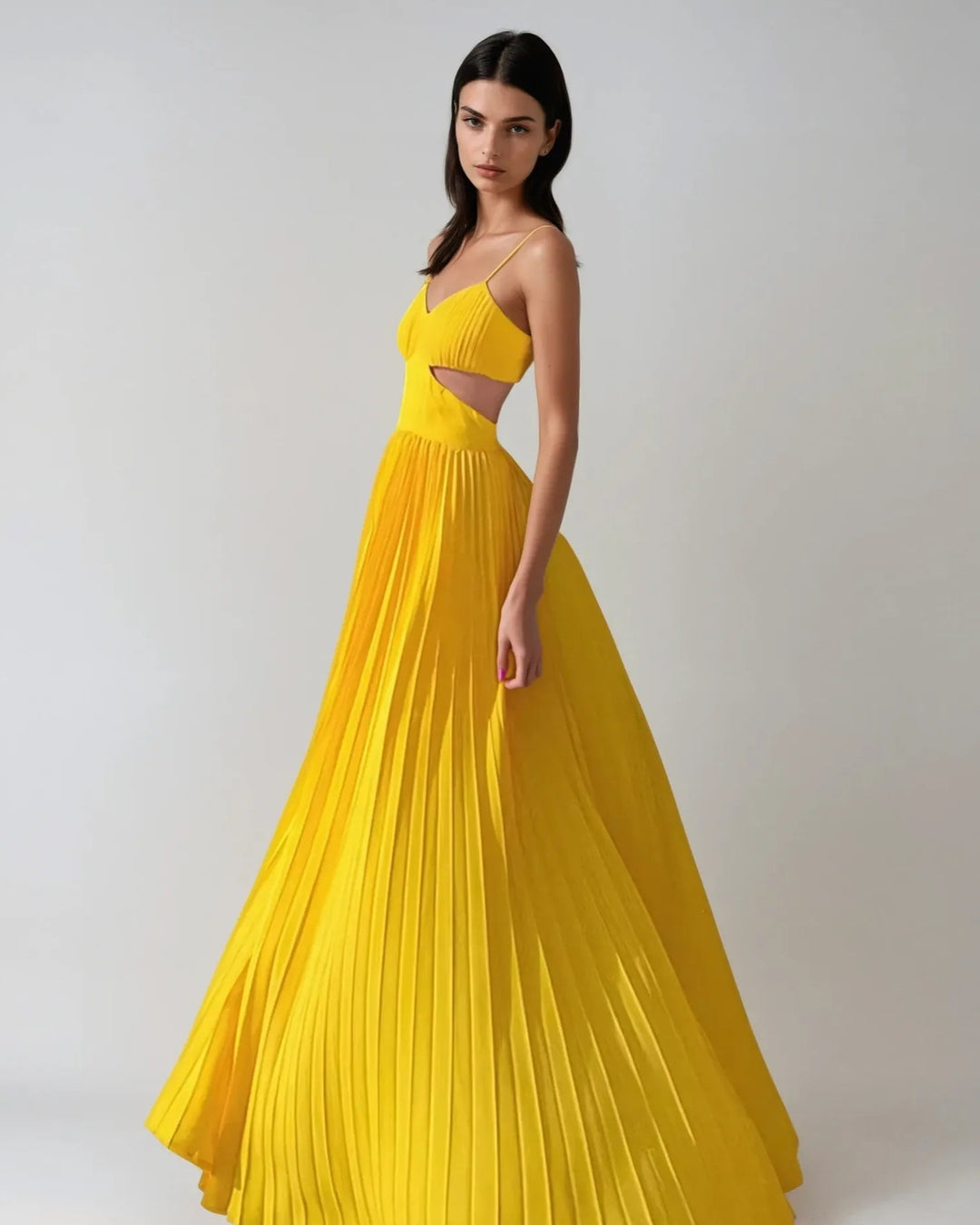 La Robe Longue Jaune Ajourée est élégamment ajourée sur les côtés sous la poitrine, pour dévoiler subtilement la peau tout en affinant la silhouette.