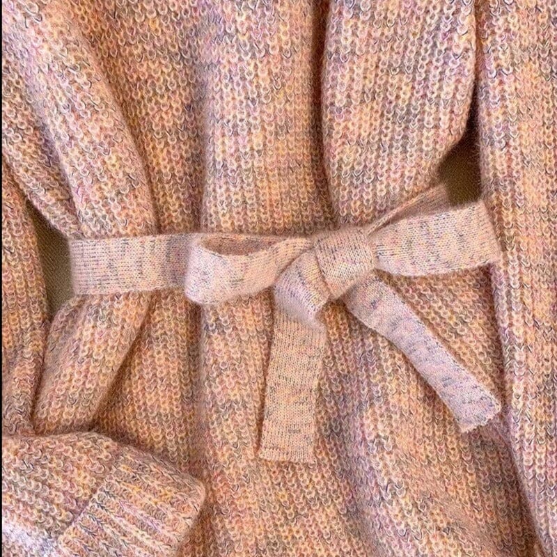 robe pull en laine rose avec ceinture, manches longues, posée sur un fauteuil beige, intérieur cosy et élégant