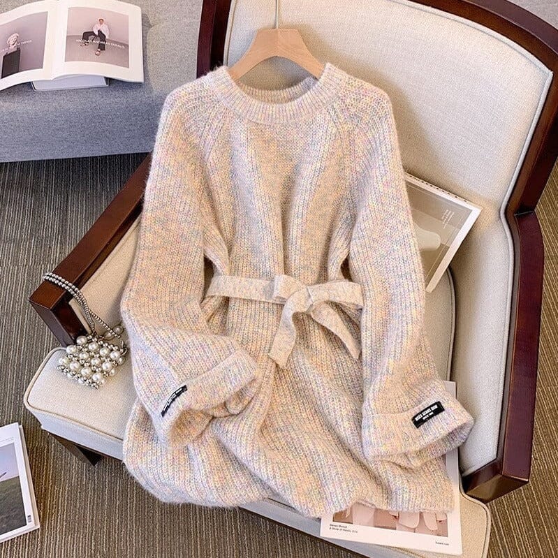 robe pull en maille beige avec ceinture romantique pour une tenue d'hiver élégante et confortable, modèle romane