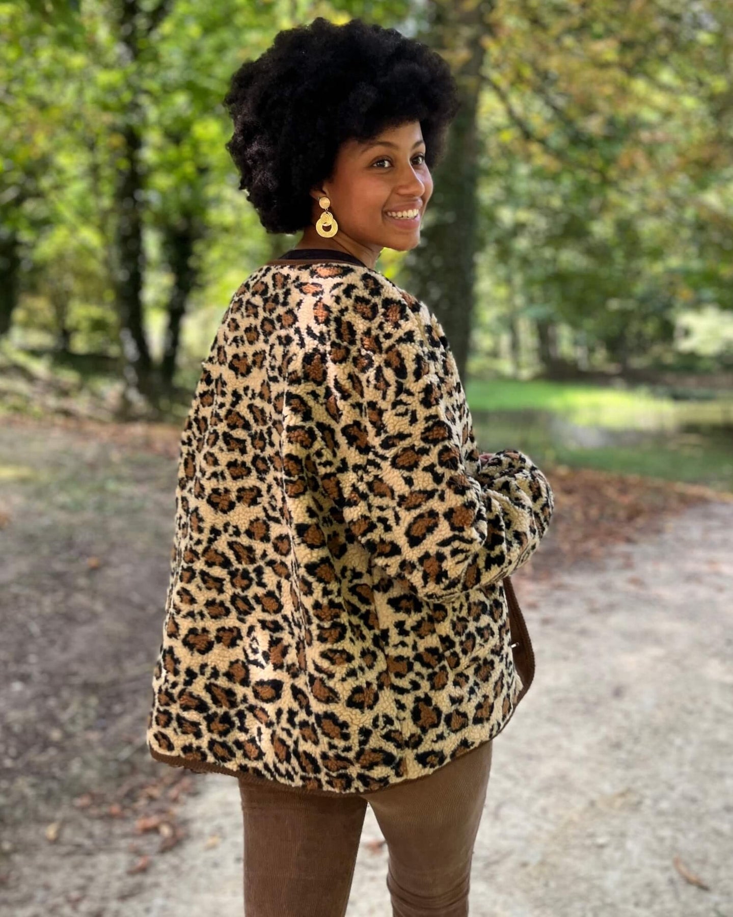 - Cette Veste En Polaire Léopard est conçue pour allier confort et style. Son tissu en sherpa, doublé de satin doux, apporte une chaleur agréable et une sensation de luxe sur la peau.